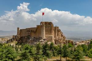 Harput Kalesi met uitzicht over de vlakte, de historische ruïnes en het natuurlijke Meer van Hazar voor zwemmen, picknicken en boottochten.